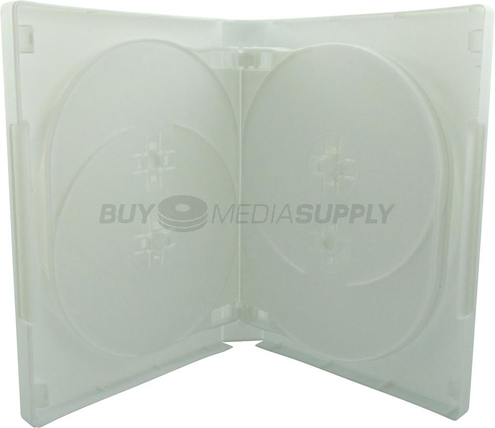 * This case is approximately twice as thick as a standard DVD case * Accommodates up to 8 discs * Has a clear outer plastic "full wrap" to hold artwork * Utilizes a push hub to hold discs * Case color is white * Also holds standard size CD media as well